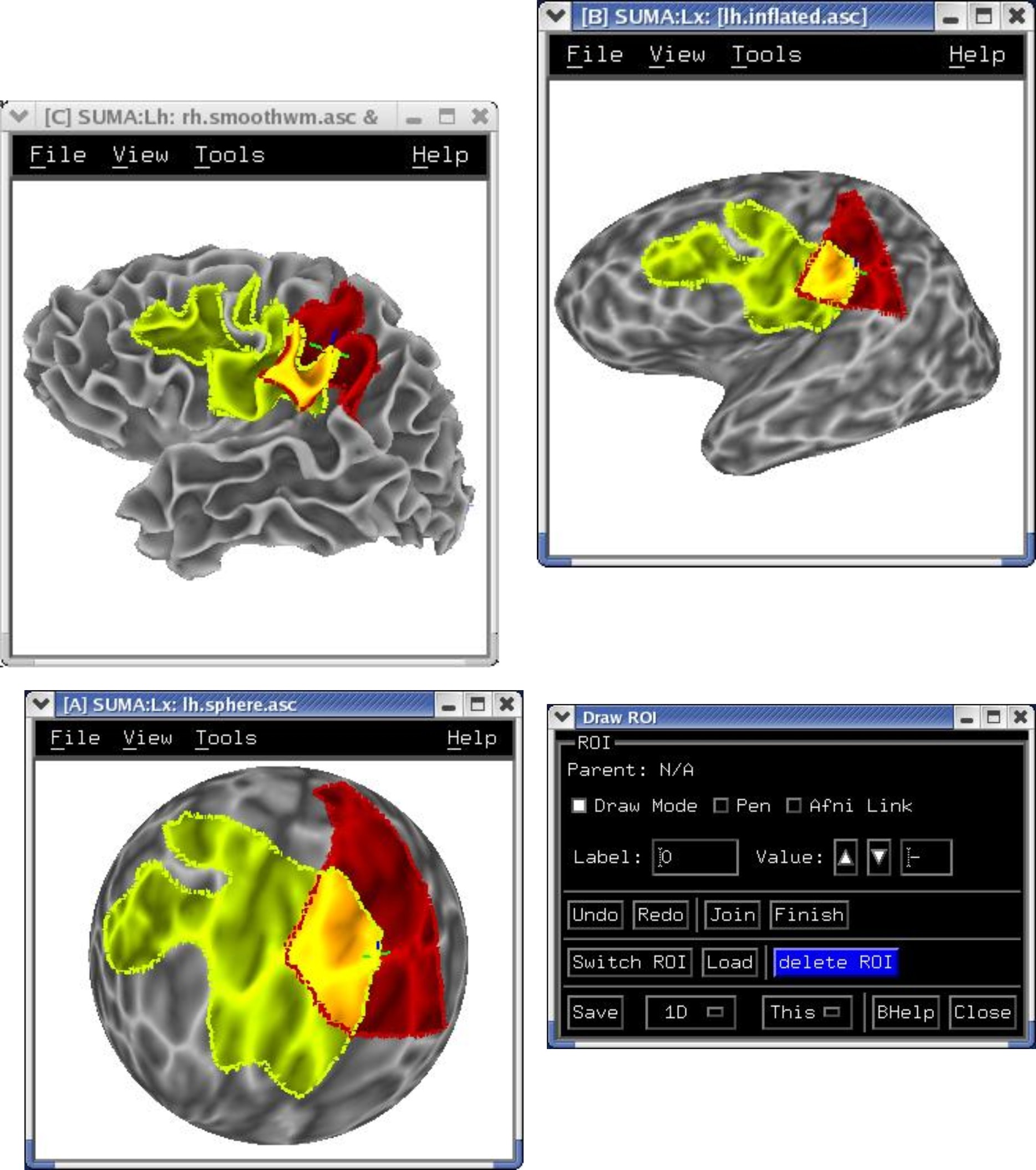 Surface models with four stacked color planes consisting of the surface convexity, drawn ROIs, functional data from AFNI and a node color data file that looks cool.
