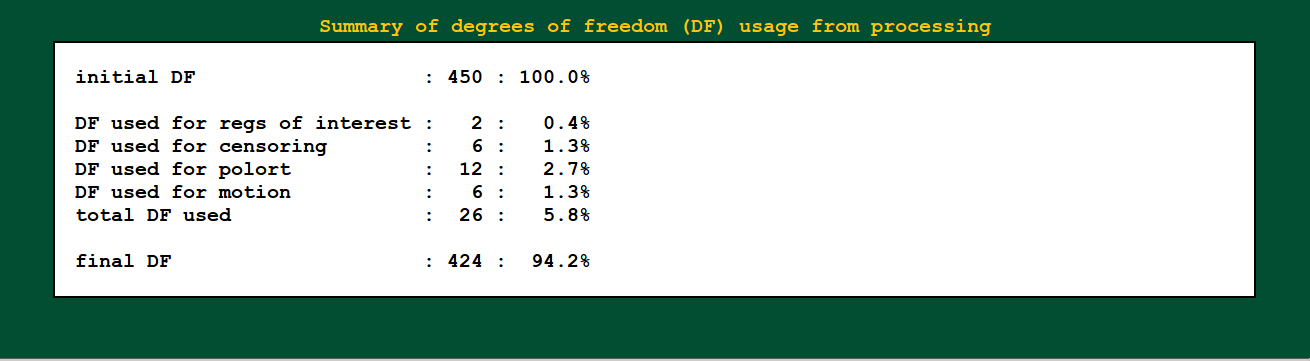 Degrees of freedom are important! You need to report them when presenting statistics. You also need to check that they don’t dip down too low due to having a lot of motion (each censored point is one DF used up), too many regressors, etc.