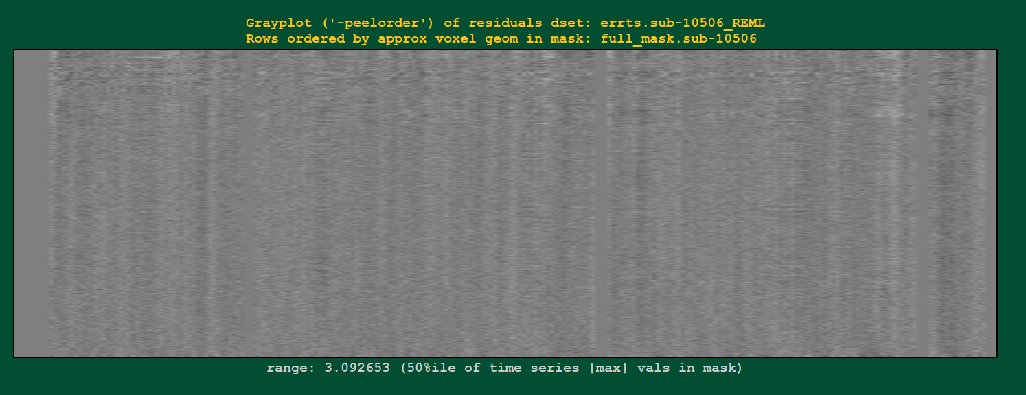 Grayplots of residuals: each row shows a grayscale version of a time series, and each column is one timepoint. Only voxels within a brain mask are included in the plot. Note that censored time points will appear as uniformly blank columns.