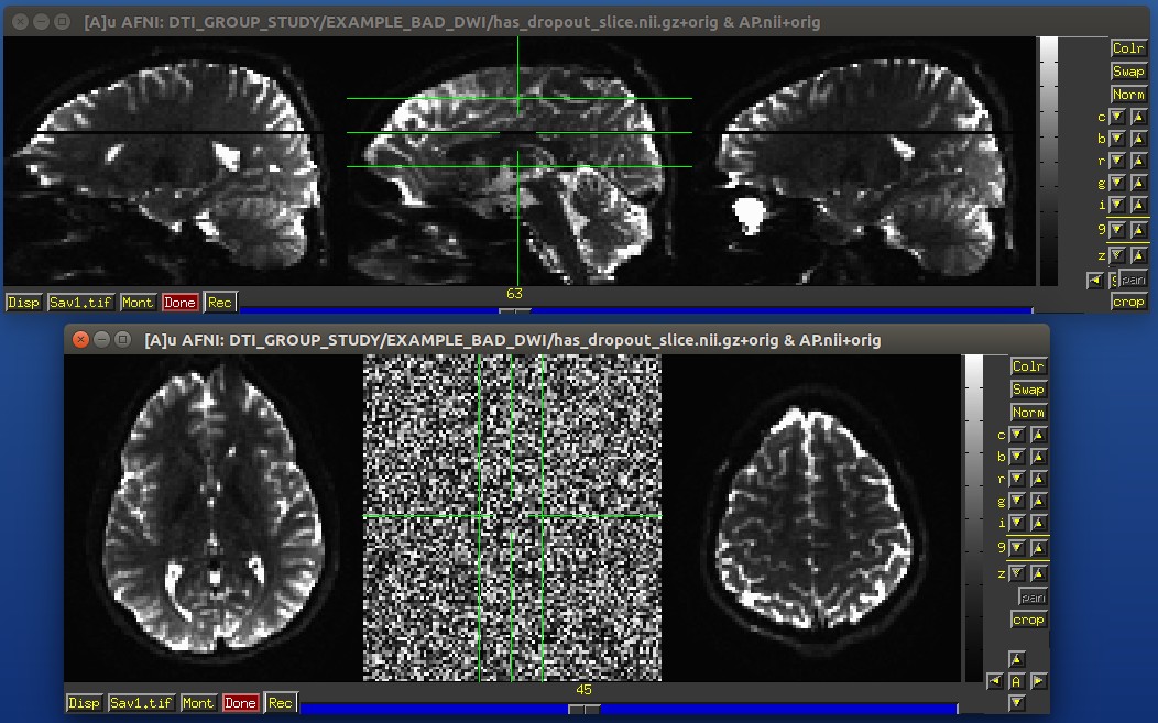 The within-TR motion is quite problematic, though. Consider a standard DWI acquisition sequence that collects axial slices in an interleaved pattern. That is, it collects slices #0, 2, 4, 6, 8, etc. and then slices #1, 3, 5, 7, etc. What happens if a person moves during this? Pre-motion slices might be fine, but those afterward are not properly measured, and a distinctive brightness pattern can be seen in a sagittal view. This is often known as the “Venetian blind” effect, and it is very easy to spot when looking at data– this would be a good candidate to filter out.