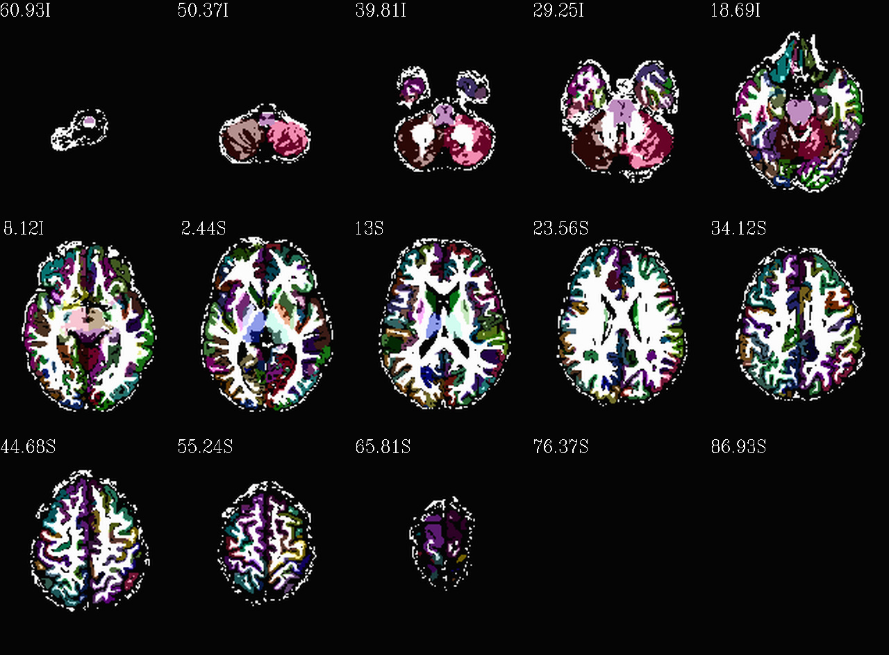 Non-inflated “2000” parc/seg map (after the non-regional ROIs were removed) olayed on FA>0.2 binary map ulay. |