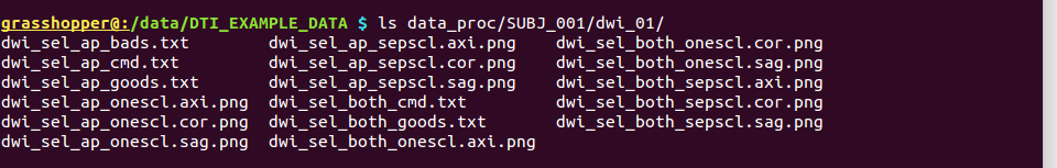 It contains the following outputs for the AP data, and analogous outputs for the PA (=”both”) dsets, but we also note that the “dwi_sel_both_goods.txt” file contains the complement of the union of ‘bad’ selections from both the AP and PA selection, and therefore the the PA (=”both”) images have fewer volumes here.